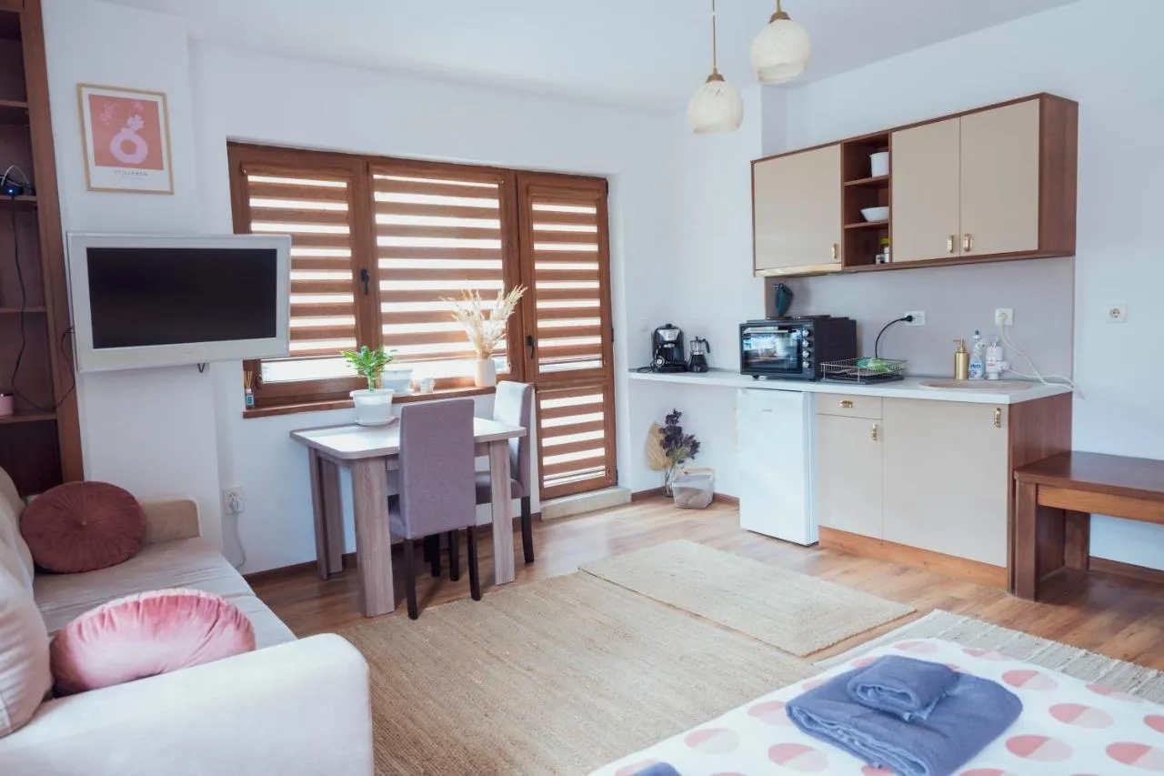 Dimensiuni: 40 mp Numar de camere: 2 camere Featuring a private entrance, this air-conditioned apartment consists of 1 living room, 1 separate bedroom and 1 bathroom with a shower and slippers. Guests can make meals in the kitchen that is equipped with a stovetop, a refrigerator, kitchenware and an oven. Boasting a terrace with garden views, this apartment also provides a washing machine and a flat-screen TV. The unit offers 1 bed. Baie privată cu duș