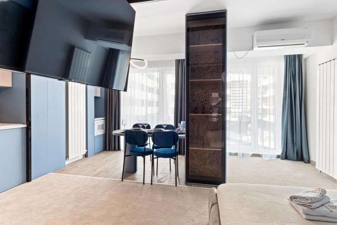 Dimensiuni: 48 mp Numar de camere: 2 camere Offering bathrobes, this studio includes a private bathroom with a shower and a hairdryer. The kitchen is fitted with a stovetop, a refrigerator and a microwave. The spacious studio offers air conditioning, a washing machine, a tea and coffee maker, a seating area and a flat-screen TV with cable channels. The unit offers 2 beds.