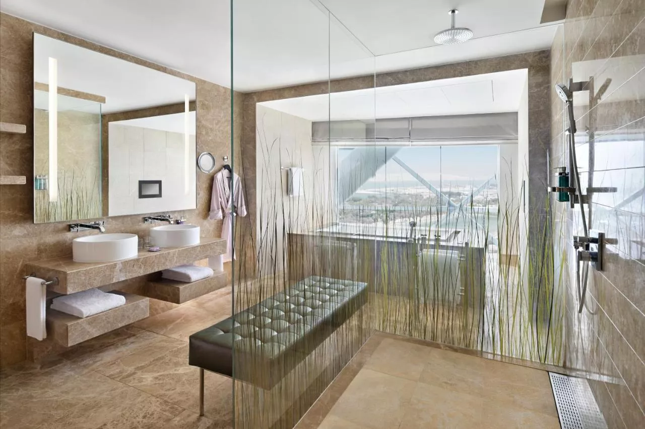 Dimensiuni: 100 mp Numar de camere: 5 camere Cameră cu aer condiționat, aparat de cafea Illy și ferestre din podea până în tavan, cu vedere panoramică la Abu Dhabi. Include o baie din marmură cu duș cu efect de ploaie și cadă adâncă.