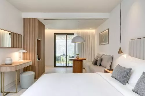 Dimensiuni: 36 mp Numar de camere: 2 camere Situate în zona exclusivistă a complexului, direct pe malul apei, aceste dormitoare atrăgătoare sunt proiectate pentru aristocrație, în tonuri de bej și ivoriu, și includ o baie cu finisaje din marmură, cadă și duș tip walk-in. Dincolo de fereastra lor, oaspeții pot coborî de pe terasa de lemn mobilată, pe treptele de marmură sidefată și se pot scufunda în Marea Ionică, amenajată într-o piscină naturală unică. Parte din Haute Living Selection, unitățile includ o serie de servicii exclusive, precum demipensiune HLS, acces la un living HLS exclusiv pentru membri, manager HLS dedicat și upgrade la facilitățile de bun venit și la articolele de toaletă.
