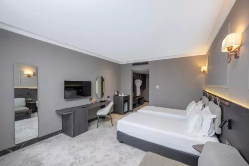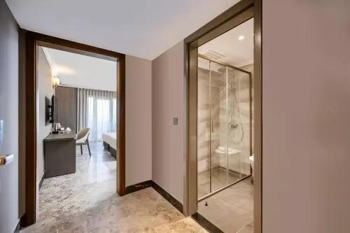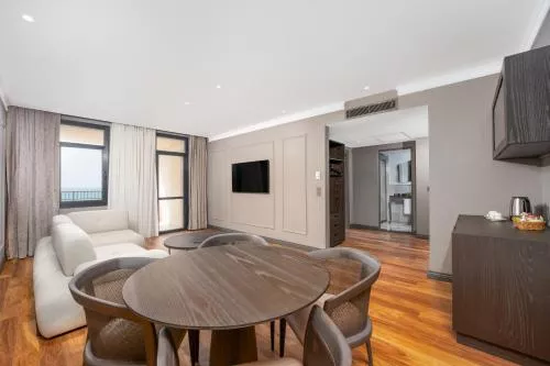 Dimensiuni: 50 mp Numar de camere: 1 camera Această suită are 1 living, 1 dormitor separat și 1 baie cu o cadă sau duș și articole de toaletă gratuite. Oferind vedere la mare, suita include aer condiționat, TV cu ecran plat cu canale prin satelit, pereți izolați fonic, minibar și aparat de ceai și cafea. Unitatea de cazare este prevăzută cu 1 pat. Baie privată cu cadă sau duș