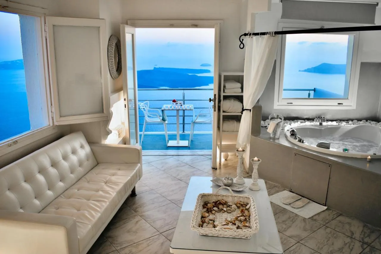 Dimensiuni: 30 mp Numar de camere: 1 camera Aegeo Honeymoon Suite Sea View & Indoor Jetted Tub Located at one of the property's highest level with a living area facing a breathtaking sea view with 3 windows, and an indoor, heated jetted bath for 2 persons by a window overlooking the Caldera, and is fitted with an equipped self catering kitchenette. The private veranda offers a panoramic sea, volcano, and sun set view. Upon arrival a bottle of wine and a bottle of mineral water are offered. Baie privată cu cadă