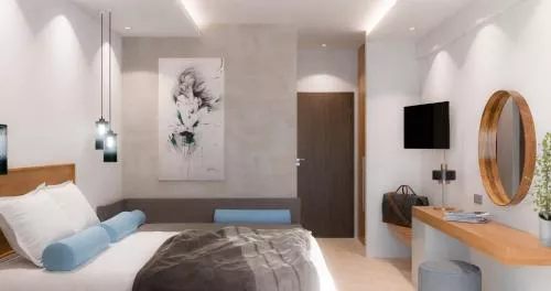 Camerele de la Aethria, cu pardoseală din gresie și culori blânde, au un frigider, un telefon și un televizor cu canale prin cablu. Fiecare unitate include o baie privată cu duș și un uscător de păr.