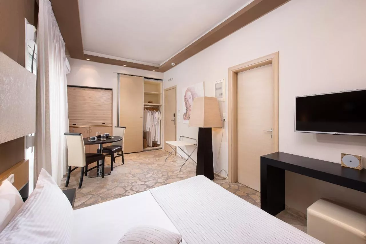Cu mobilier de design și o decorație colorată și inspirată, fiecare dintre suitele Afrodite, cu stil individual, oferă cuptor cu microunde, cafetieră și aparat de făcut sandvișuri. Se oferă papuci și halate de baie.