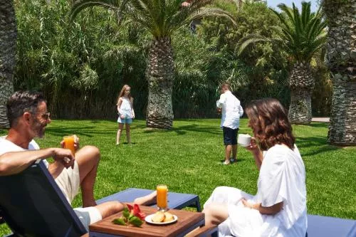 Micul dejun grecesc este servit zilnic în zona de luat masa a proprietății. Acesta constă în diverse tipuri de brânzeturi, plăcinte de casă și miere. Oaspeții pot lua masa la restaurantul principal al hotelului, care oferă arome internaționale și grecești și pot explora o varietate de cine cu bufet tematice care se schimbă la fiecare 2 săptămâni. Taverna de pe plajă Akrogiali, cu vedere directă la mare, oferă un bufet cu bucătărie tradițională grecească și mediteraneană pentru prânz și rețete cretane tradiționale pentru cină à la carte. Restaurantul de street-food mediteranean Taka-Taka va atrage oaspeții cu varietatea sa de feluri de mâncare din 6 bucătării. Pentru iubitorii de bucătărie italiană, piazza d'Italia servește cele mai iconice rețete.
