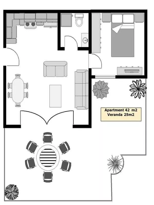 Dimensiuni: 34 mp Numar de camere: 1 camera Apartament cu aer condiționat, vedere la mare și TV LCD. Capacitatea acestei camere este de 2 adulţi şi 2 copil. Baie privată cu duș