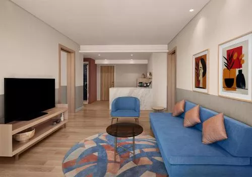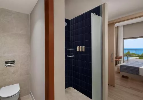 Dimensiuni: 45 mp Numar de camere: 2 camere Această suită cu aer condiționat are 1 dormitor și 1 baie cu duș și uscător de păr. De asemenea, suita are TV cu ecran plat și canale prin satelit, minibar și balcon cu vedere la mare. Unitatea de cazare include 2 paturi.