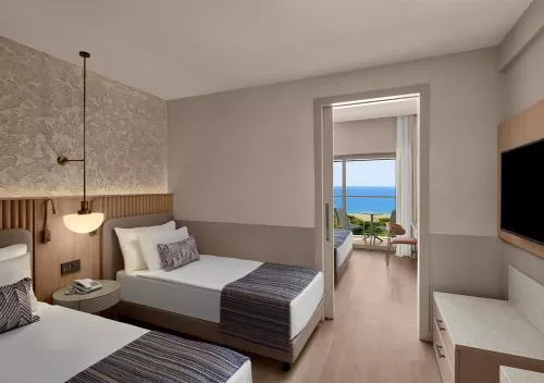 Dimensiuni: 48 mp Numar de camere: 2 camere Această cameră de familie este spațioasă și include aer condiționat, minibar, baie privată cu duș și un balcon cu vedere la mare. Unitatea de cazare include 3 paturi.