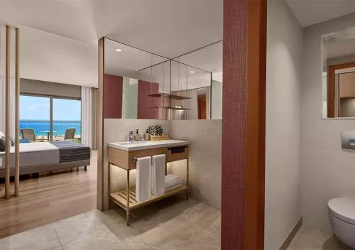 Dimensiuni: 34 mp Numar de camere: 2 camere Beneficiile deosebite ale acestei camere duble includ acces la o piscină cu vedere. Această cameră dublă spațioasă are aer condiționat, minibar, baie privată cu duș și balcon cu vedere la mare. Unitatea de cazare include 1 pat.