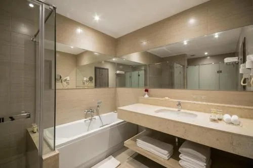 Dimensiuni: 110 mp Numar de camere: 2 camere Această suită are suprafața de 110 m² și este prevăzută cu 2 televizoare cu ecran plat, aer condiționat cu reglaj individual și 2 băi cu halate de baie, papuci, cadă cu hidromasaj și cabină de duș. De asemenea, suita oferă WiFi gratuit, acces telefonic direct, facilități pentru prepararea de ceai și cafea, precum și toaletă pentru oaspeți. Această suită are dormitor matrimonial și lounge.