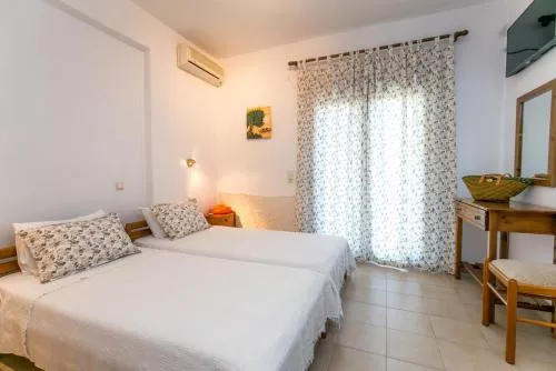 Toate camerele de la Pensiunea Aldebaran au balcon cu vedere la grădină, curte sau Marea Egee. Fiecare este dotată cu un frigider și un televizor cu canale prin satelit. Baia privată este echipată cu o cabină de duș.