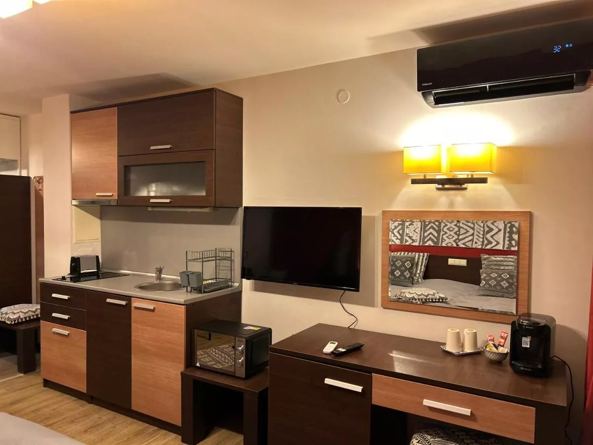 General : Detector de monoxid de carbon Încălzire Aer condiţionat Bucătărie: Mașină de cafea Masă Cuptor cu microunde Frigider Prăjitor de pâine Ustensile de bucătărie Chicinetă Cană fierbător Media/Tehnologie: TV cu ecran plat TV Baie: Prosoape Uscător de păr Toaletă Hârtie igienică Cadă Baie privată Caracteristicile clădirii: Apartament privat în clădire Zonă de living: Zonă de relaxare Zonă de luat masa Exterior: Terasă Balcon Facilităţile camerei: Priză lângă pat Vedere: Vedere la curtea interioară Dormitor: Lenjerie de pat Garderobă sau dulap