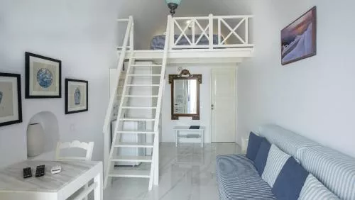 Dimensiuni: 25 mp Numar de camere: 2 camere Features a bedroom on the loft, seating room, bathroom with shower, breathtaking views of the Caldera, the volcano and Fira centre. Baie privată cu duș