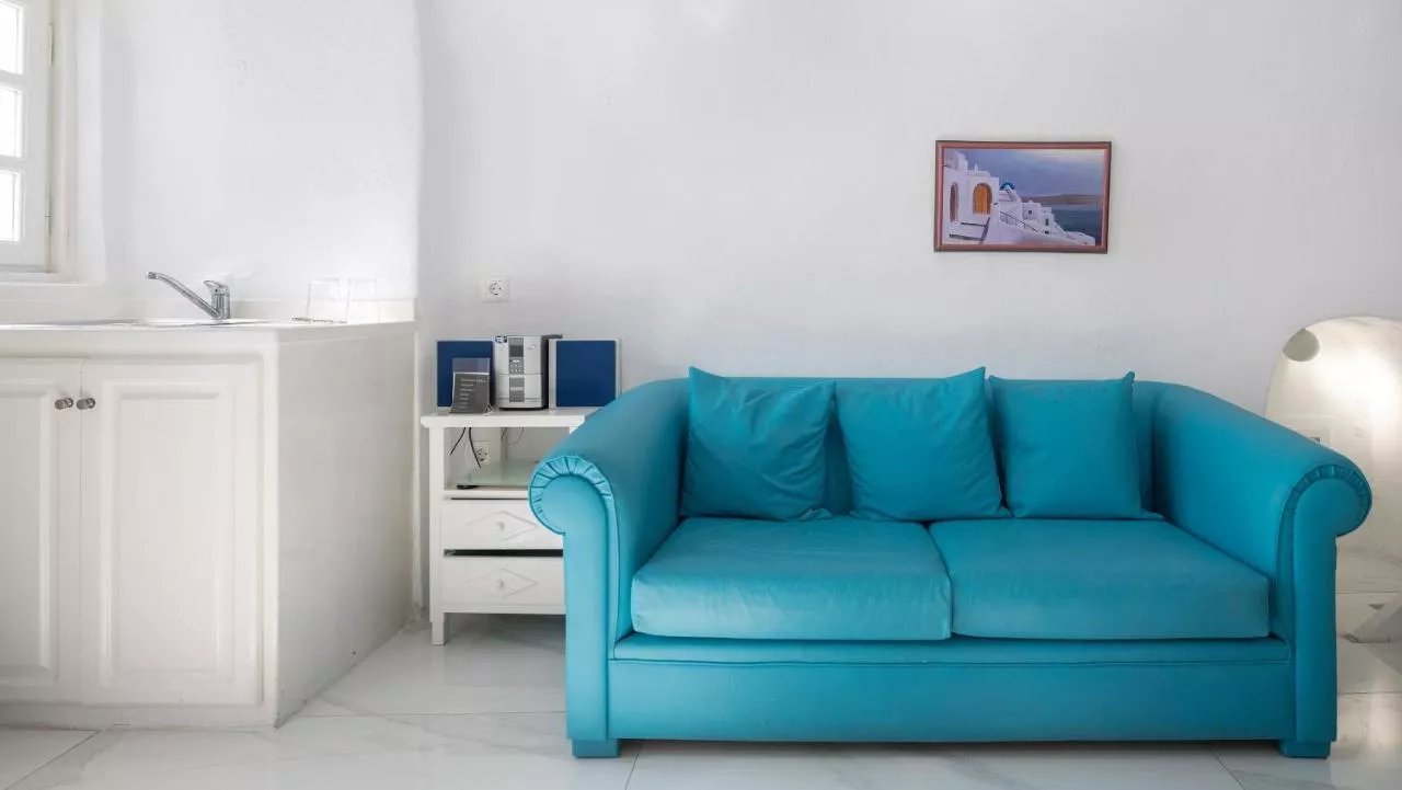 Camerele și suitele albe sunt construite în conformitate cu stilul tradițional cicladic, având tavanul în formă de cupolă. Fiecare unitate cu aer condiționat este dotată cu un televizor LCD cu satelit, frigider și uscător de păr. Majoritatea se deschid către verande private, oferind vederi uluitoare.