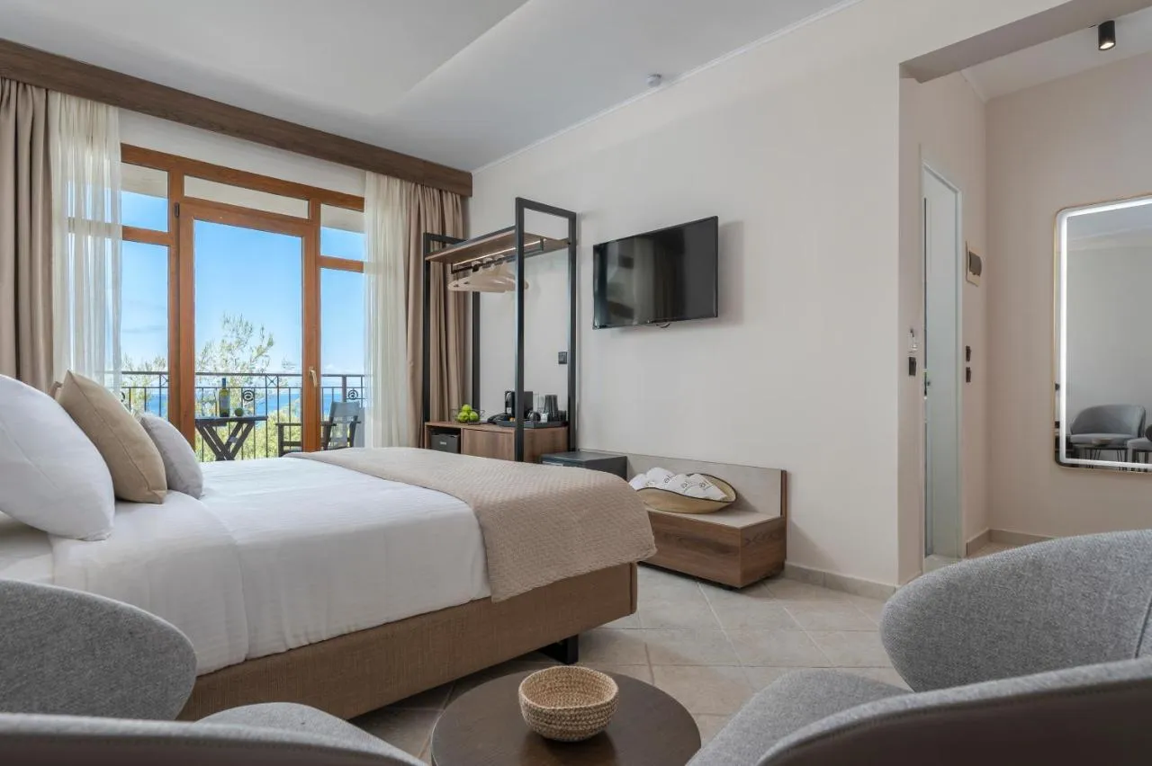 Dimensiuni: 30 mp Numar de camere: 1 camera Această suită Junior are decor modern, realizat în 2019, o piscină privată încălzită și vedere panoramică la mare și la peninsula Sithonia. Unitatea are o verandă spațioasă cu mobilier și șezlonguri, un pat dublu și o baie cu cabină de duș. Baie privată cu cadă sau duș