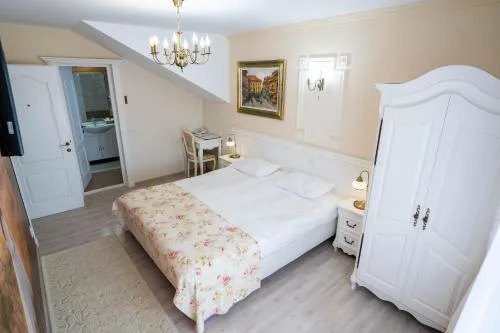 Dimensiuni: 35 mp Numar de camere: 1 camera Această cameră de 5 stele decorată clasic are mobilier din lemn lucrat manual şi picturi originale ale vechiului oraş Suceava şi oferă facilităţi moderne, precum acces gratuit la internet WiFi şi prin cablu, aer condiţionat, facilităţi pentru prepararea de cafea, precum şi TV cu ecran plat și canale prin satelit. Baia privată este dotată cu cadă spa și duș cu hidromasaj, halate de baie, papuci și uscător de păr.