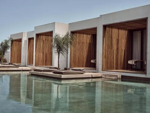 Dimensiuni: 53 mp Numar de camere: 4 camere Această suită cu aer condiţionat este mai spaţioasă şi are terasă cu piscină privată şi vedere la Marea Ionică. Include: