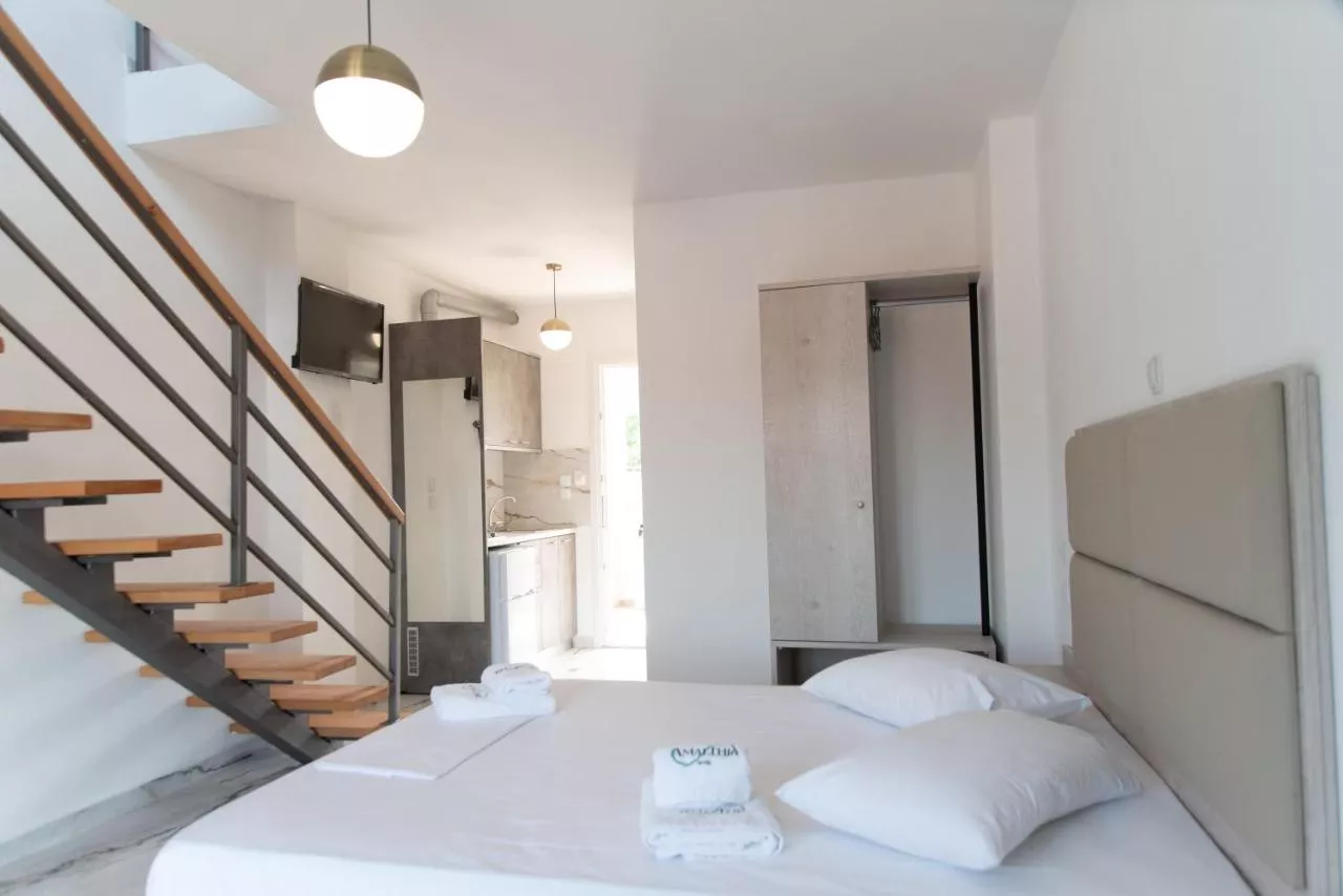 În hotel, fiecare cameră este dotată cu aer condiționat, un birou, o terasă cu vedere la oraș, o baie privată, un televizor cu ecran plat, lenjerie de pat și prosoape. Amalthia oferă anumite camere cu vedere la mare, iar camerele au un balcon. Toate unitățile din cazare sunt echipate cu articole de toaletă gratuite și un computer.