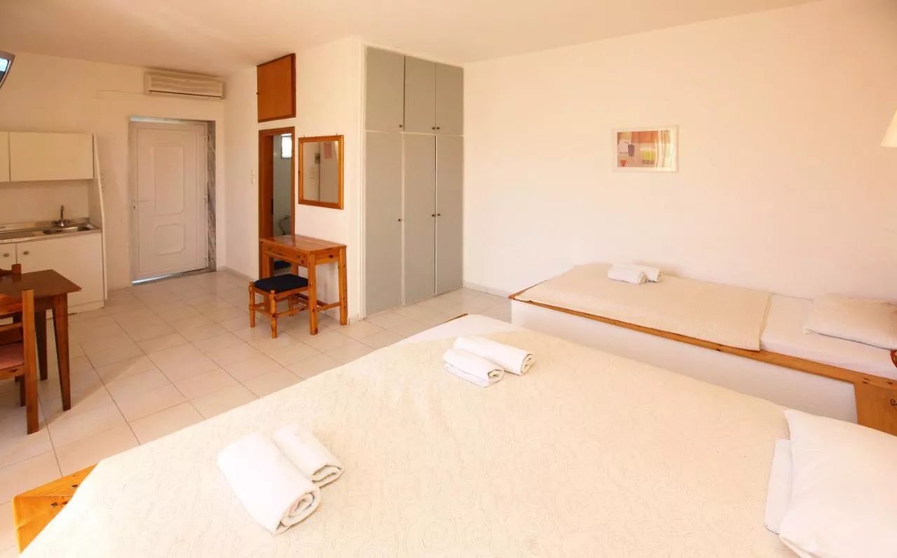 Cu pereți colorați și paturi încorporate, toate studiourile au un balcon sau o terasă cu vedere la Marea Egee, la munte sau la grădină. Fiecare are o chicinetă cu plite de gătit, un fierbător și o masă de luat masa. Facilitățile includ de asemenea aer condiționat și un televizor cu canale prin satelit.