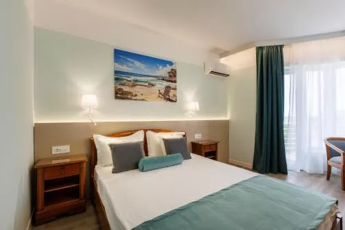 Dimensiuni: 22 mp Numar de camere: 2 camere Această cameră twin/dublă este deosebită deoarece oferă acces la o piscină cu vedere. Camera twin/dublă are aer condiționat,șifonier, baie privată cu duș, precum și terasă cu vedere la mare.