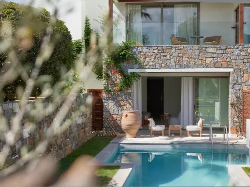 Dimensiuni: 65 mp Numar de camere: 1 camera Amirandes Creta Villa with Courtyard, Sea View & Private Heated Pool. This split-level villa is 65m² and has indoor and outdoor living areas. It is set in an elegantly landscaped private garden with a breathtaking sea view and a luxurious infinity pool 15m², heated up to 25*C upon request with extra charge (90€ per day).