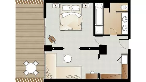 Dimensiuni: 40 mp Numar de camere: 1 camera Această cameră constă dintr-un dormitor, un living care pot fi folosite ca zonă de dormit pentru copii și un balcon sau terasă cu vedere la grădină. Baia privată este dotată cu cabină de duș, cadă și chiuvetă dublă. Baie privată cu cadă