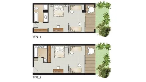 Bungalourile sunt încadrate de: o zonă de grădină la malul mării și majoritatea de o mică grădină cu pereți direct în afara băii, astfel încât să vă puteți bucura de grădina din cadă.