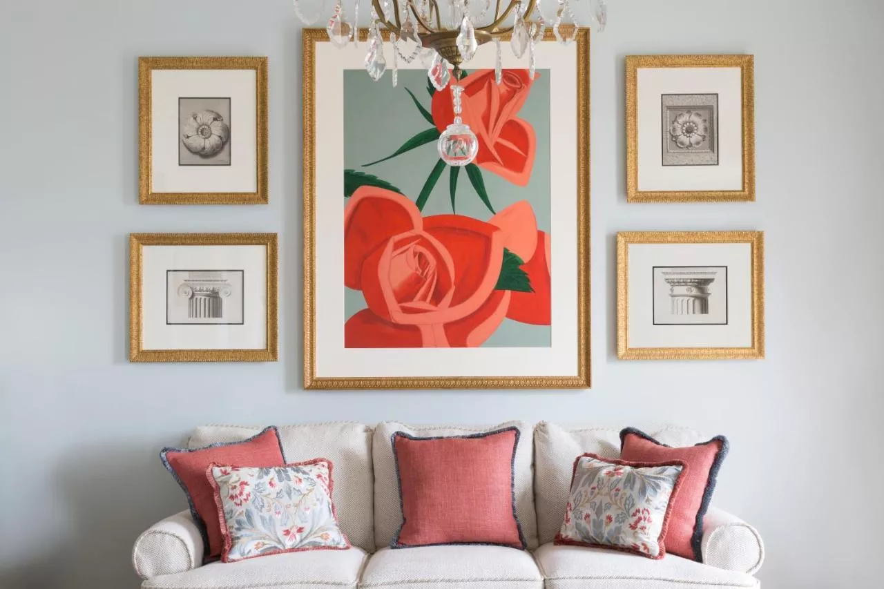 Floral tones by Manuel Canovas and Veraseta dress the main bedroom. A serene space, it features a sitting area, two large dressing rooms and a 270-square-foot bathroom.