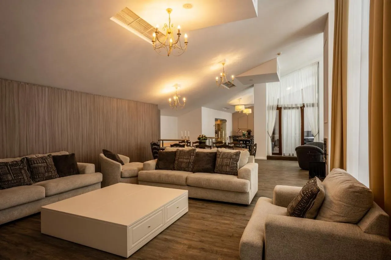 Dimensiuni: 282 mp Numar de camere: 1 camera The sauna and fireplace are the special features of this apartment. Boasting a private entrance, this air-conditioned apartment comes with 1 living room, 4 separate bedrooms and 6 bathrooms with a bath and a shower. Meals can be prepared in the well-fitted kitchen, which features a stovetop, a refrigerator, a dishwasher and kitchenware. The spacious apartment features soundproof walls, a minibar, a tea and coffee maker, a flat-screen TV with cable channels, as well as garden views. The unit has 7 beds. Baie privată cu cadă