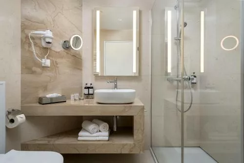 Baie: Halat de baie Prosoape Articole de toaletă gratuite Papuci de casă Uscător de păr Toaletă Duş Hârtie igienică Baie privată General : Seif Hipoalergică Încălzire Aer condiţionat Vedere: Vedere la mare Accesibilitate: Etaje superioare accesibile cu liftul Media/Tehnologie: TV cu ecran plat TV Telefon Canale prin cablu Facilităţile camerei: Priză lângă pat Exterior: Balcon Piscină privată Dormitor: Lenjerie de pat Mâncăruri și băuturi: Minibar