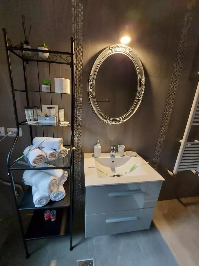 Dimensiuni: 60 mp Numar de camere: 2 camere This apartment's special feature is the fireplace. Featuring a private entrance, this apartment consists of 1 living room, 1 separate bedroom and 1 bathroom with a shower and a hairdryer. The well-fitted kitchen features a stovetop, a refrigerator, kitchenware and a microwave. Boasting a terrace with garden views, this apartment also provides a tea and coffee maker and a flat-screen TV with streaming services. The unit offers 2 beds. Baie privată cu duș