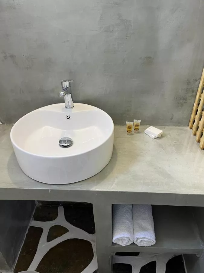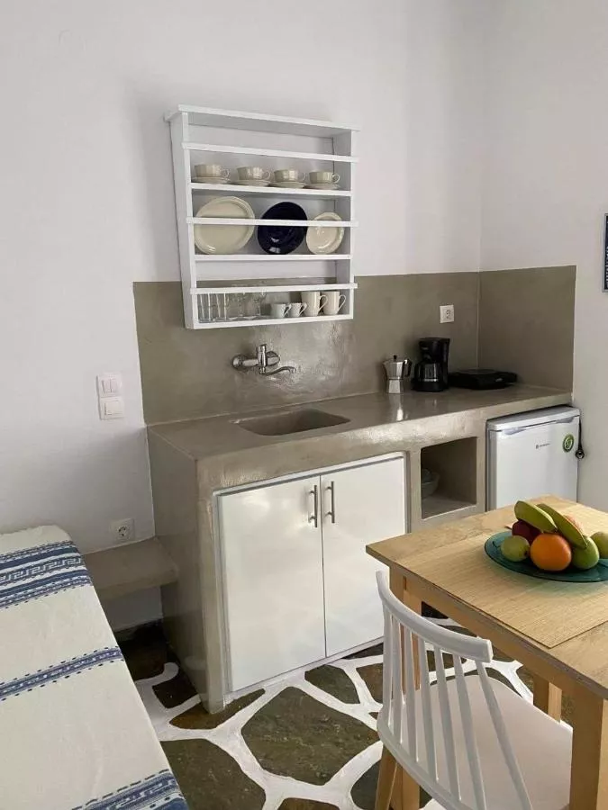 Urmărind stilul local, studiourile de la Angie sunt decorate în tonuri de albastru și alb. Toate au o baie proprie și sunt echipate cu un televizor, un frigider mic, un aparat de cafea și un fierbător electric.