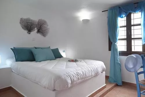 Dimensiuni: 35 mp Numar de camere: 2 camere Traditionally decorated, this split-level suite opens to a balcony with Aegean Sea views. On the ground floor, there is a seating area along with a kitchenette, while a staircase leads to the bedroom with a four-poster bed. Baie privată cu duș
