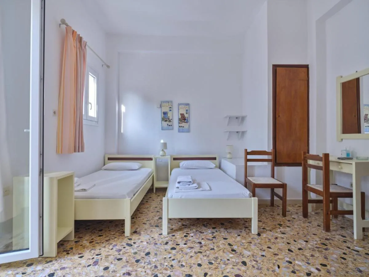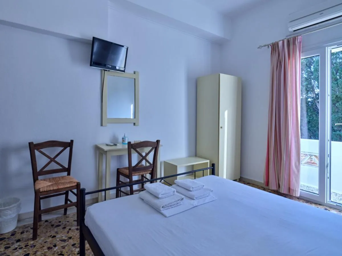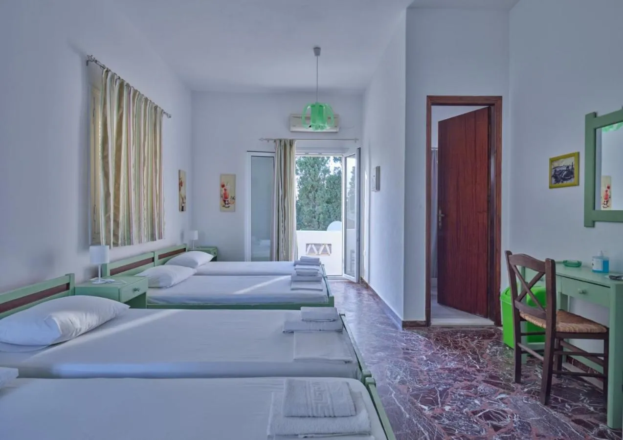 Camerele de la Pensiunea Paros sunt decorate cu detalii tradiționale și dispun de mobilier din lemn. Acestea sunt echipate cu un televizor, un fierbător electric și un frigider mini. Unele camere oferă vederi spre Marea Egee.