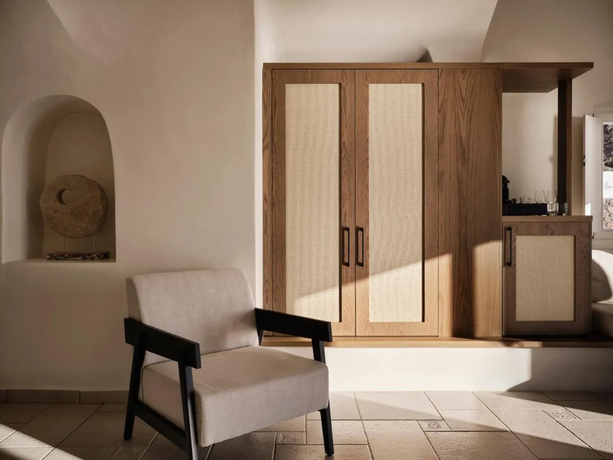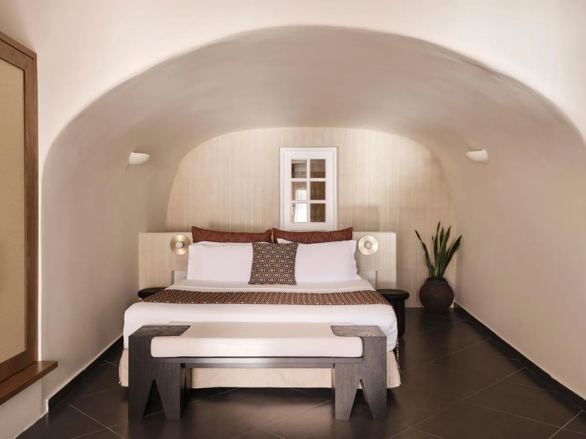 Dimensiuni: 55 mp Numar de camere: 1 camera Această suită este amenajată pentru a oferi liniște și vedere nesfârșită la arhitectura vulcanică. Zona de living interioară impresionantă este plină de farmec în simplitatea acesteia: o peşteră cu tavan înalt, cu o zonă spaţioasă de living şi de luat masa şi un dormitor cu pat king-size. Baia mare are duş şi jacuzzi interior. Veranda în aer liber are o terasă pentru plajă şi o zonă de luat masa sub pergolă.