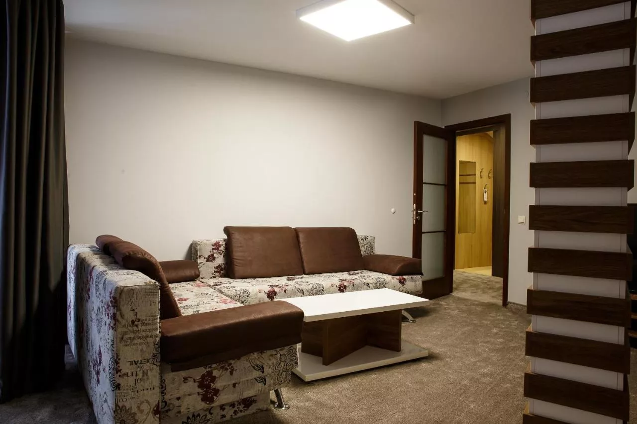 Dimensiuni: 80 mp Numar de camere: 2 camere Acest apartament cu 2 dormitoare este mobilat modern și are 2 paturi duble, o cameră de zi spațioasă cu canapele și zonă de relaxare, un dulap, o măsuță de toaletă cu oglindă, TV LED și podea cu mochetă. Apartamentele au o baie cu cabină de duș.