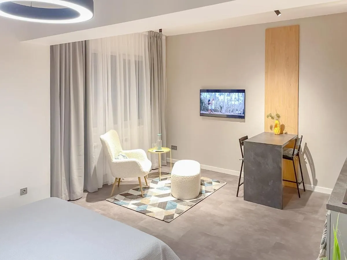 Dimensiuni: 30 mp Numar de camere: 2 camere The studio includes a private bathroom fitted with a walk-in shower, a bidet and a hairdryer. In the well-fitted kitchenette, guests will find a stovetop, a refrigerator, kitchenware and an oven. The air-conditioned studio features a flat-screen TV with streaming services, a private entrance, a tea and coffee maker, a seating area as well as a quiet street view. The unit has 1 bed. Baie privată cu duș