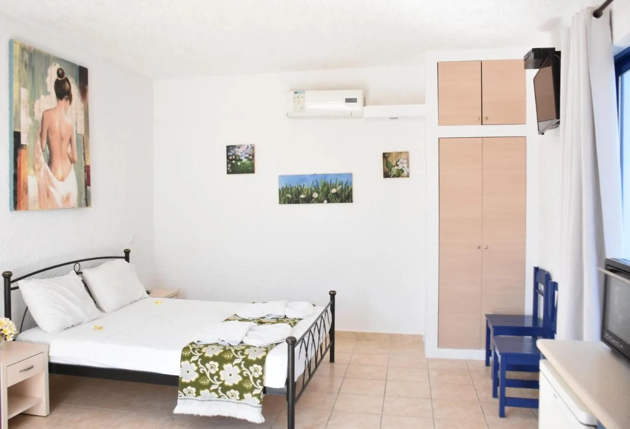 Fiecare cameră de la Kiotari Beach are un balcon cu vedere la mare, este luminoasă și însorită, cu pardoseli din gresie și mobilier din lemn. Fiecare este dotată cu aer condiționat, baie privată și frigider.