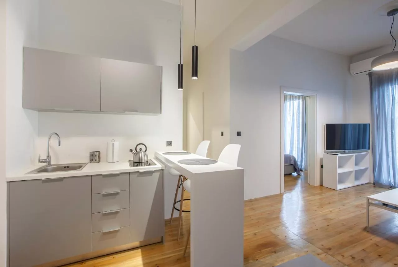 Room Amenities: Hardwood or parquet floors Sofa Iron Seating Area Socket near the bed Sofa bed Wardrobe or closet Cleaning products Air conditioning Food & Drink: Dining table Refrigerator Stovetop Kitchenware Kitchenette Electric kettle Accessibility: Upper floors accessible by elevator Upper floors accessible by stairs only Media & Technology: Flat-screen TV TV Services & Extras: Towels Linen Building characteristics: Private apartment in building Bathroom: Bath or shower Hairdryer Toilet Toilet paper Private bathroom Outdoor & View: Balcony City view
