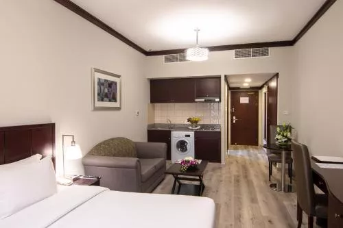 Dimensiuni: 39 mp Numar de camere: 14 camere All our simply sophisticated Studio rooms feature free wireless high-speed internet, a flat-screen multi-channel TV, a seating area with cosy sofa-bed, a full length mirror and an elegant work desk. There is a fully equipped kitchenette with a microwave / toaster / hot water kettle / cooking-ware / washing machine and a large refrigerator. Tea / Coffee / Creamer / Sugar sachets are generously stocked & replenished daily free of cost. An electronic safe locker to store your valuables is available inside each wardrobe with an iron & ironing board. All our bathrooms feature a bathtub, hair dryer and are well provided with complimentary toiletries. Complimentary Transfer to La Mer Beach.