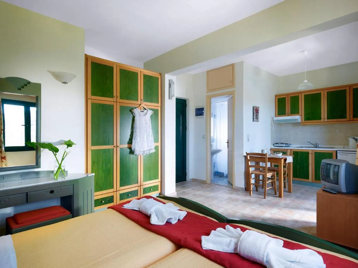 Dimensiuni: 20 mp Numar de camere: 1 camera The third person is accommodated in a rollaway bed. The studio is fitted with air conditioning, fully equipped kitchenette with cooking hobs, mini fridge and coffee machine. The studio opens up to a furnished balcony or veranda enjoying views of the Lygaria Bay.