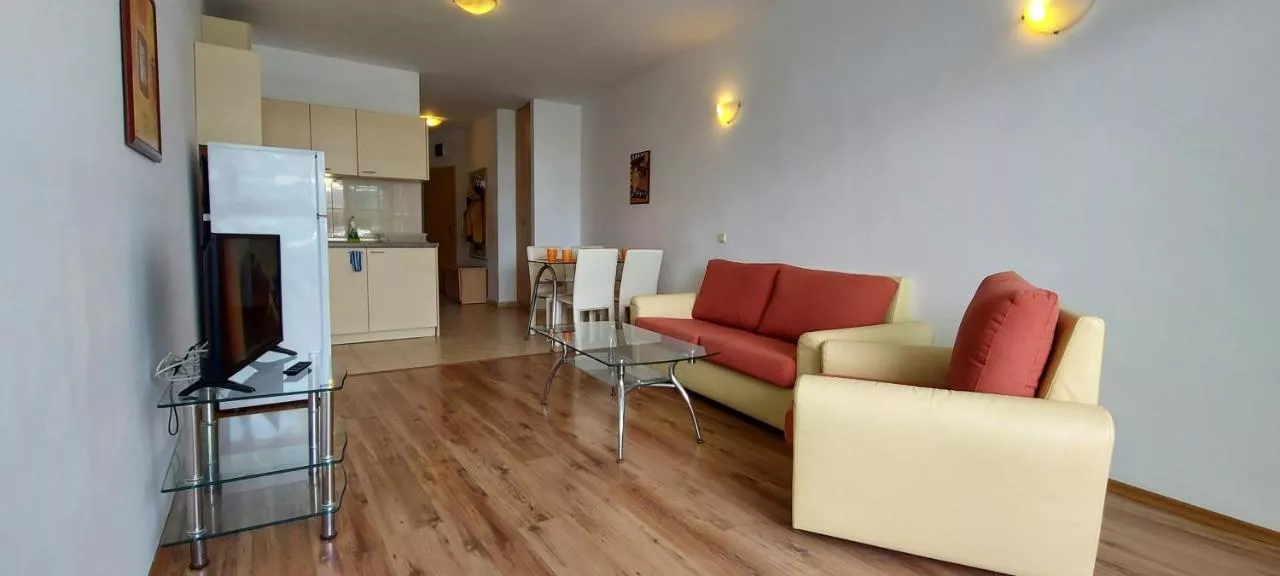 Dimensiuni: 90 mp Numar de camere: 1 camera Apartamentul are cameră de zi cu zonă de luat masa, bucătărie complet utilată și balcon cu vedere la piscină.
