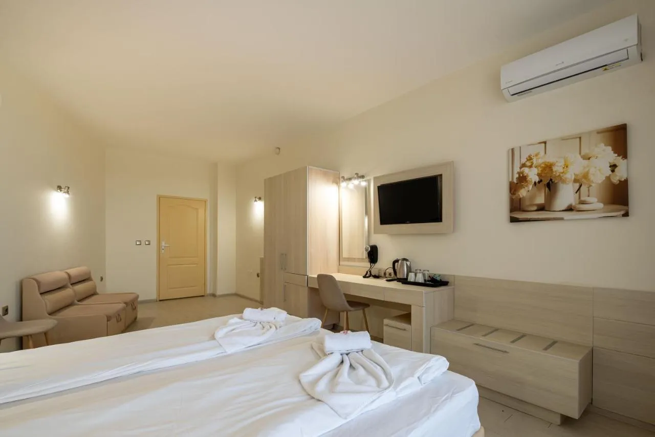 Oaspeților li se oferă opțiunea unui mic dejun, prânz și cină contra cost, utilizarea gratuită a piscinei exterioare cu șezlonguri, seif la recepție. Toate aceste servicii sunt disponibile în clădirea principală a Hotelului Aphrodite Beach ****, pe Strada Perla nr. 17. La recepția hotelului puteți obține, de asemenea, informații detaliate despre petrecerile de seară, care sunt organizate în restaurantul principal al hotelului.