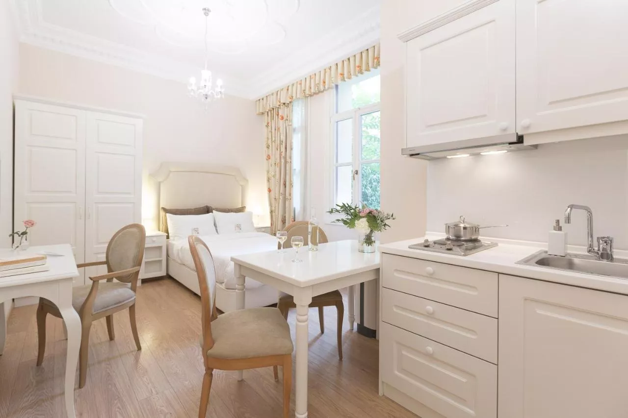 Bathroom: Bathrobe Free toiletries Slippers Hairdryer Toilet Shower Toilet paper Private bathroom Food & Drink: Coffee machine Dining table Tea/Coffee maker Microwave Refrigerator Stovetop Kitchenware Kitchenette Electric kettle Kitchen Room Amenities: Safety deposit box Hardwood or parquet floors Iron Drying rack for clothing Socket near the bed Heating Wardrobe or closet Soundproofing Air conditioning Accessibility: Upper floors accessible by elevator Media & Technology: Flat-screen TV Pay-per-view channels TV Laptop Telephone Cable channels Satellite channels Services & Extras: Wake-up service Towels Linen Building characteristics: Private apartment in building Outdoor & View: Garden view Physical distancing: Single-room air conditioning for guest accommodation