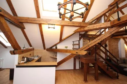 Dimensiuni: 50 mp Numar de camere: 1 camera Acest studio are zonă de relaxare la nivelul inferior și o zonă de dormit la nivelul superior, accesibilă pe scări.