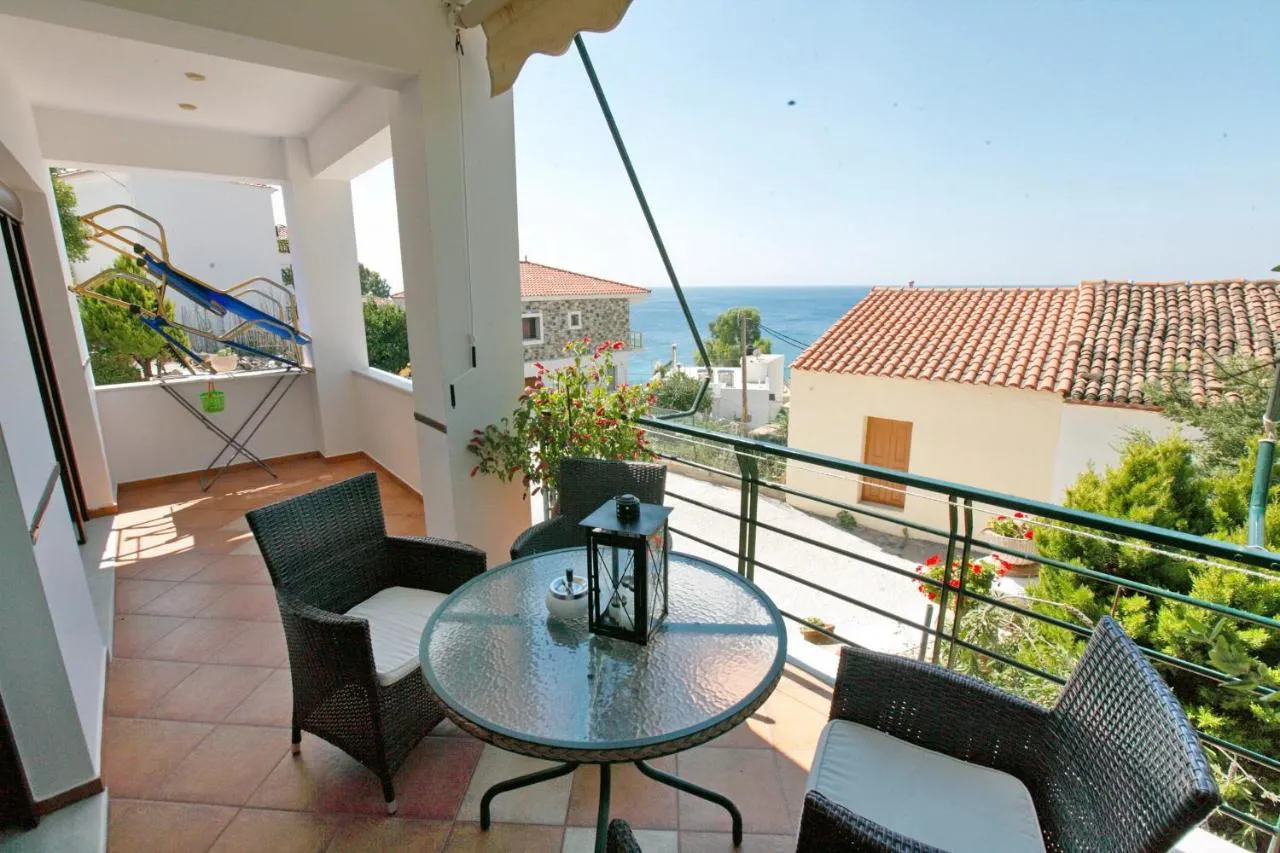Dimensiuni: 75 mp Numar de camere: 2 camere Opening to a balcony with Plomari Village and Aegean Sea views, this spacious, air-conditioned apartment features: