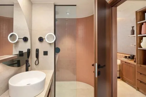 Baie: Halat de baie Prosoape Articole de toaletă gratuite Papuci de casă Cadă sau duş Uscător de păr Toaletă Hârtie igienică Baie privată Bucătărie: Mașină de cafea Cană fierbător General : Seif Pardoseală de gresie/marmură Izolare fonică Plasă de ţânţari Aer condiţionat Media/Tehnologie: TV cu ecran plat TV Telefon Canale prin satelit Servicii: Serviciu de trezire Zonă de living: Canapea Vedere: Vedere la piscină Vedere la grădină Exterior: Terasă Balcon Mâncăruri și băuturi: Aparat pentru prepararea de ceai/cafea Minibar Facilităţile camerei: Canapea extensibilă Dormitor: Garderobă sau dulap Curățenie și dezinfectare: Dezinfectant pentru mâini