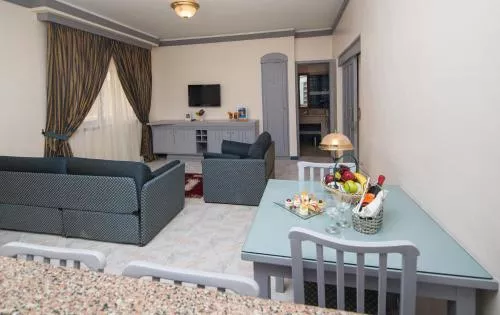 Dimensiuni: 45 mp Numar de camere: 1 camera The spacious bungalow is an ideal choice for family accommodation, it consists of one bed room and one living room with two sofa beds for children. It has a TV, a telephone, and a minibar.