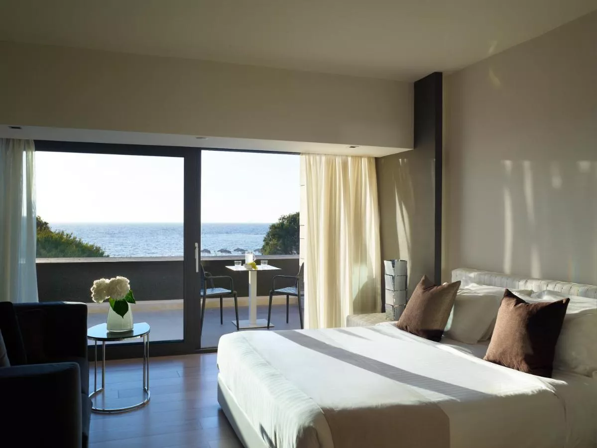 Dimensiuni: 30 mp Numar de camere: 3 camere The suite features a floor-to-ceiling window showcasing direct Aegean Sea views. Baie privată cu cadă sau duș