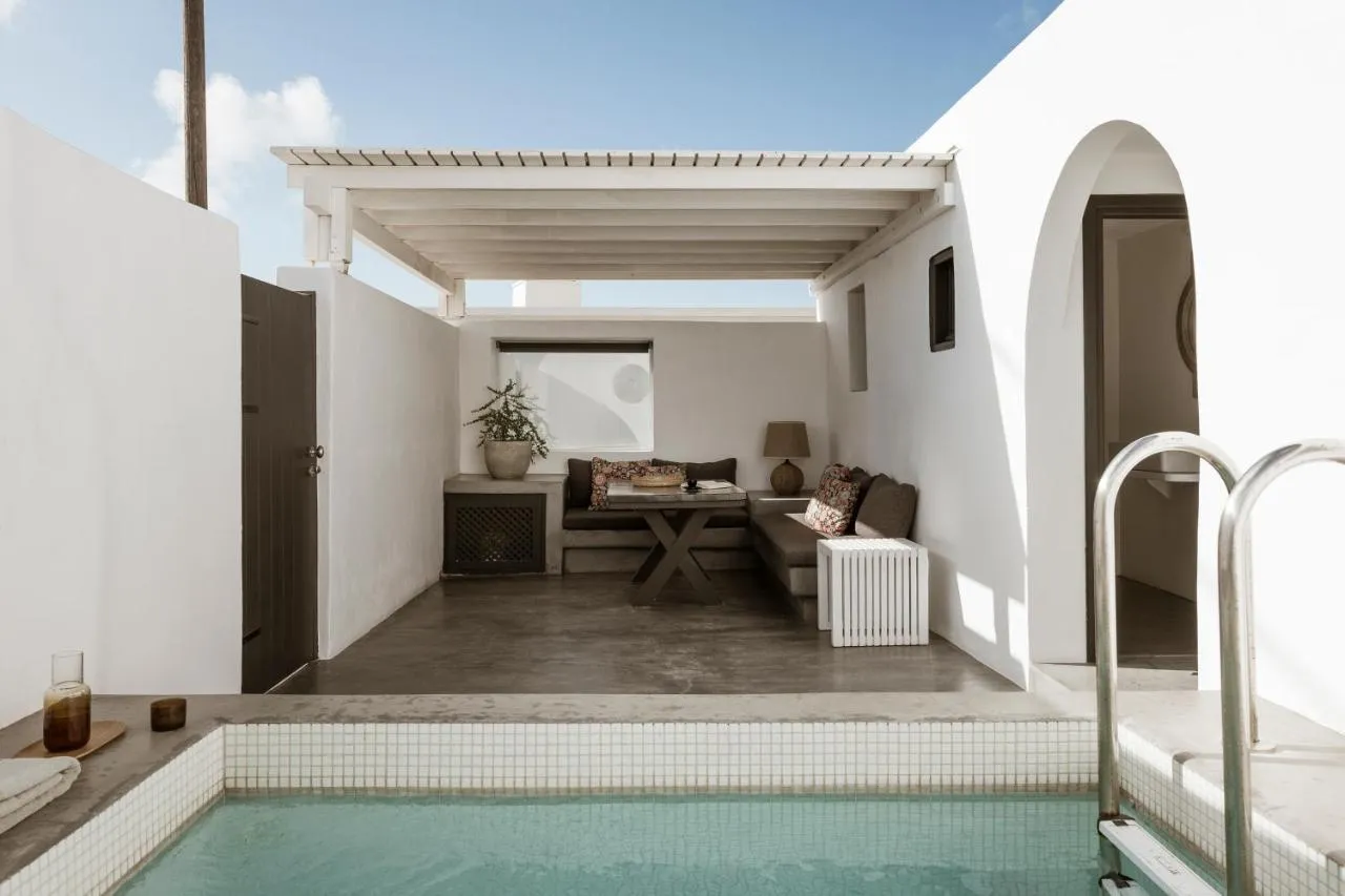 The Suite features a spacious private veranda on the upper floor. The veranda offers an outdoor dining area, sun loungers and a swimming pool (not heated) where you can enjoy your relaxing moments overlooking the Caldera and the Volcano.